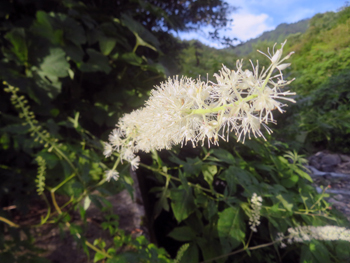 | トリアシショウマ | (鳥足升麻) | ゆきのした科、多年生。 | 白 | 若い茎、葉が鳥の足に似ていることから命名。花時には草丈30cmほど、時に1m近くになる多年草。分岐した花茎がさらに枝分かれするのが特徴です。分岐した花茎のまわりに小さな白い花をびっしりとつけます。