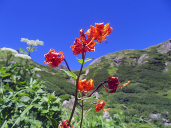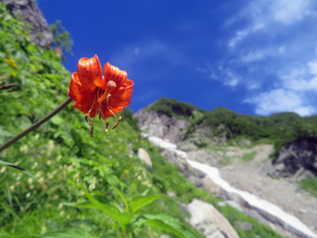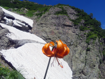 | クルマユリ | 雪渓底部空間。 背景は天狗菱 | キンポウゲ |