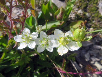 | タカネツメクサ | 高嶺爪草 | 〃 | 〃 | 5 | 高さは3-7cmになる。葉は対生し、針形で、長さは8-15mmになる。 花は直径1cmほどで茎先に1個つく。 岩場にカーペット状の株を作って,多数の花を咲かせている。 花弁に切れこみはないが,先端が尖らず,円形になる。 岩場にカーペット状の株を作って,多数の花を咲かせている。 花弁に切れこみはないが,先端が尖らず,円形になるのが特徴。 | 〃 |