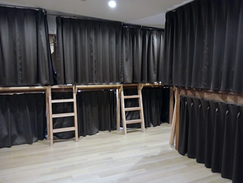 ・ 大部屋を一人分づつに遮光カーテンで区分けした小部屋風に改造してるので、居心地満足です。