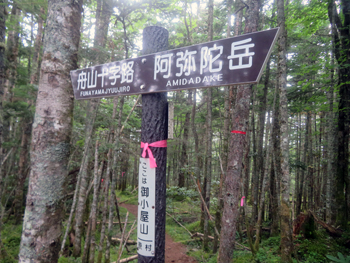 | 双葉SA付近より八ヶ岳 | 行者小屋前の分岐、中岳・阿弥陀道入口 | 阿弥陀岳 : 行者小屋より |