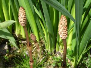 | 〃 ムスカリーとラッパスイセン : 事務棟前 | 〃 ツクシ : 事務棟前 | 〃 ミツマタ(三又)の花:祈りの丘下 |