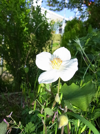 | ヘビイチゴの実 : 事務棟前 | シャスターデージー(キク科) : 〃 | アワフキムシ(泡吹虫)の泡 |