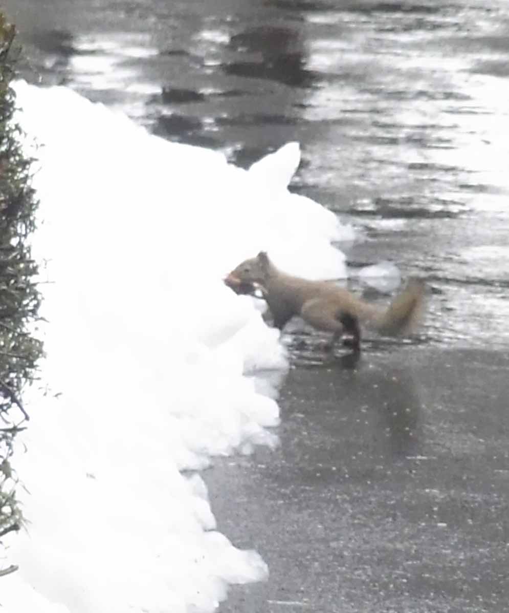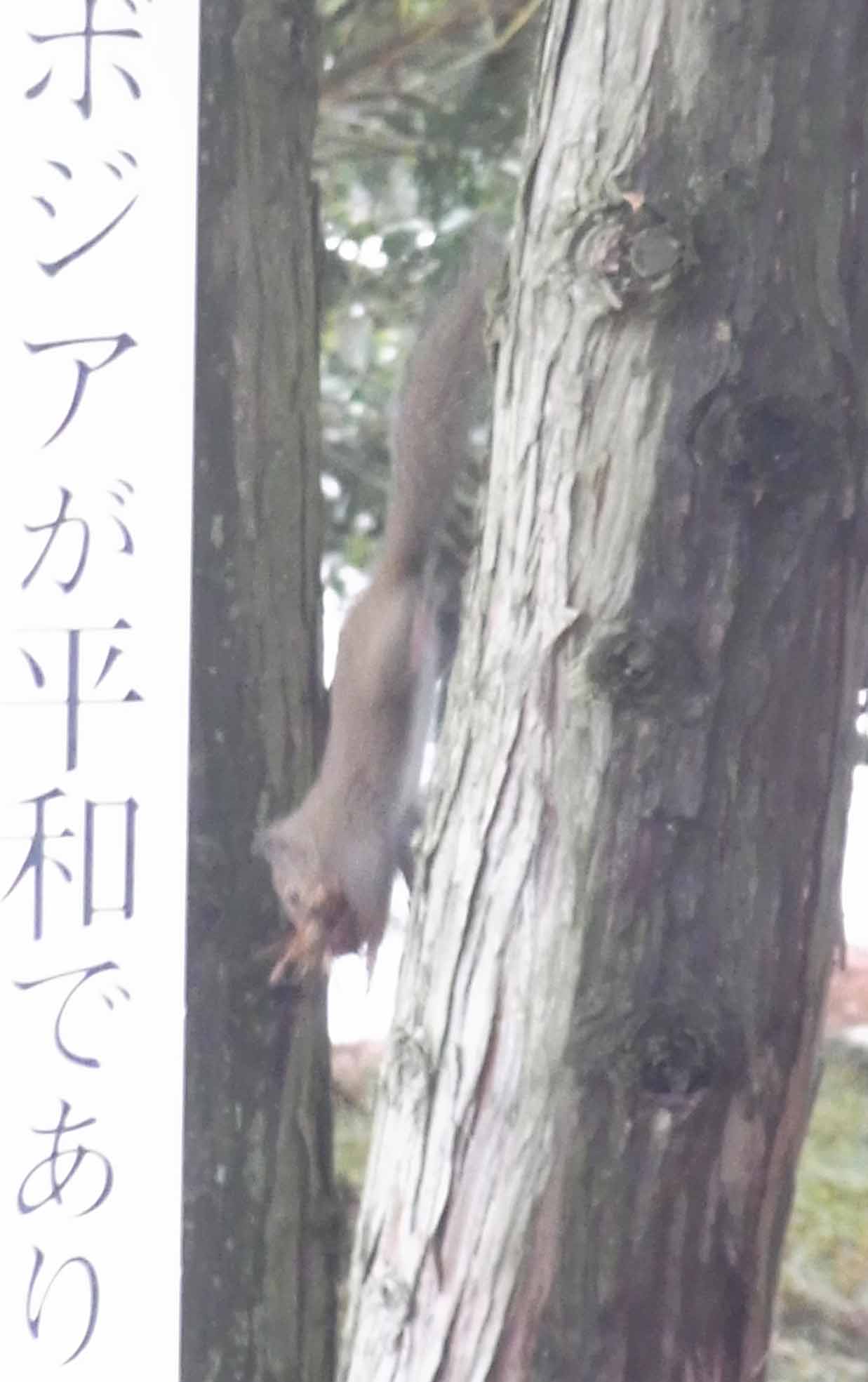 | 雪上から餌をくわえたまま、あっというまに木に登り、枝から枝へジャンプ、すばしっこく移動するリス。 トイレ棟前。 ケヤキ : 本館前 | ||